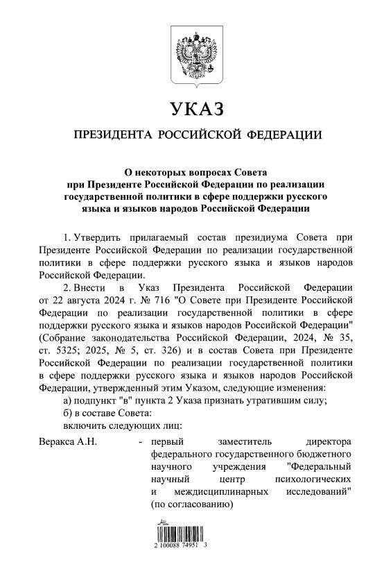 Указом Президента Российской Федерации от 14.04.2026 года №257 Александр Николаевич Рудяков, ректор нашего Института, доктор филологических наук, профессор включен в состав Президиума Совета при Президенте Российской Федерации по реализации государственной политики в сфере поддержки русского языка и языков народов Российской Федерации.